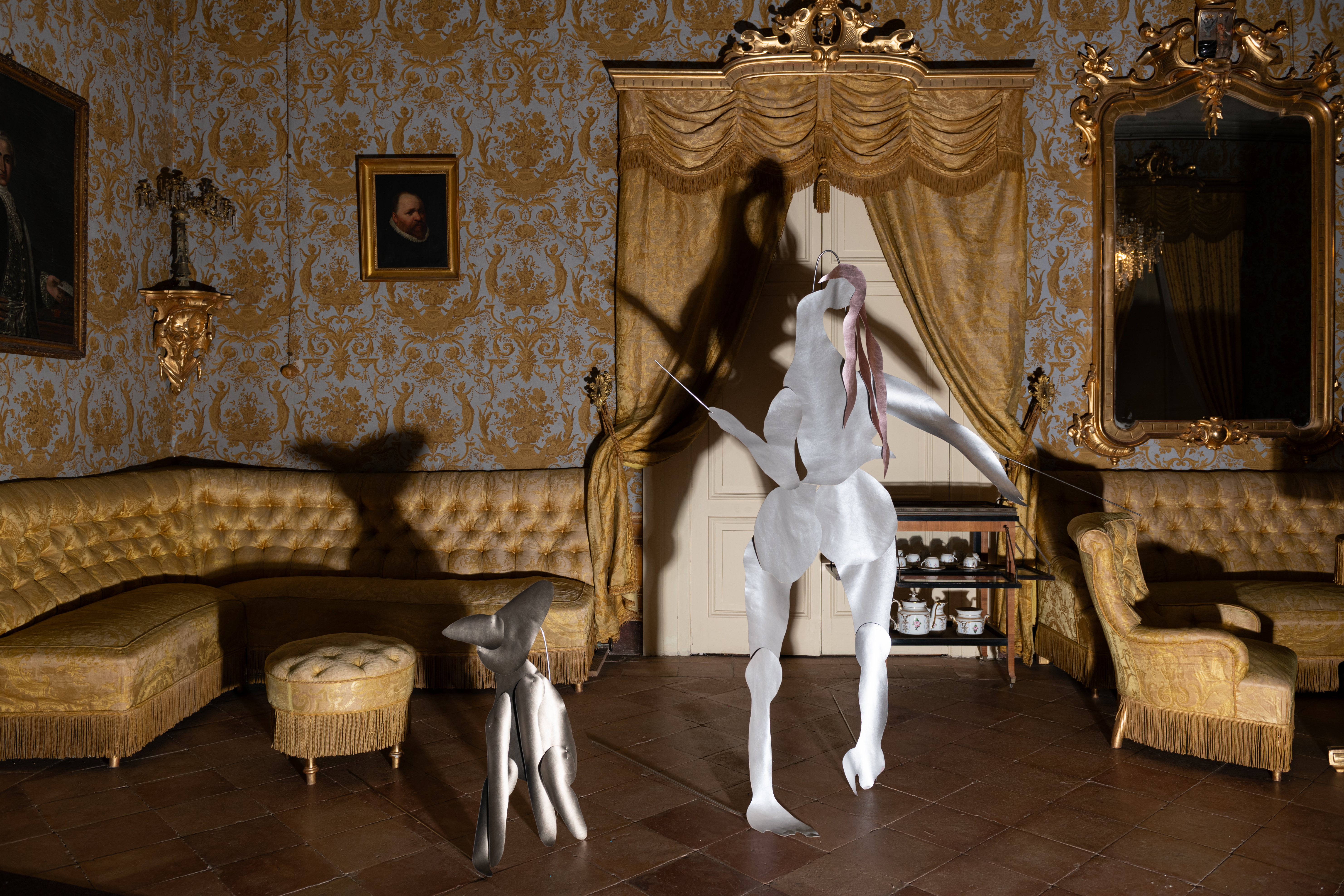 A spin-off of How To Become a Character Rather Than a Delusion—a series of works made of eco-leather silhouettes fixed to the wall that reinterpret scandalous, perverse, and vicious figures from medieval frescoes—Valentina has detached herself from the wall to inhabit three-dimensional space. Her decision has generated an imbalance that wavers, a fragile oscillation. Now, as she struggles to remain upright, micro-movements can be glimpsed that imitate the imperceptible variations of a breathing body. Like a ghostly presence absorbed in its transition, poised between the desire to remain nailed to the wall and the urge to stand autonomously in space, Valentina bears witness to the precariousness, the difficulty, and the pain of inhabiting a dominant narrative and a shared space in which she cannot recognize herself. She feels off-balance, unstable, disharmonic, crumpled, disordered. Like a premonition, watching her, a coyote: an archetype of the trickster, a liminal figure who, while creating disorder, is a wild ferryman of change capable of unsettling the established order of things.